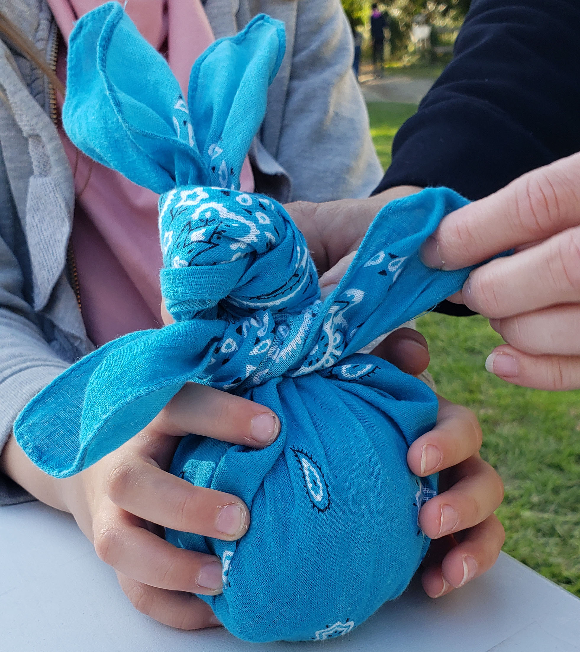 A partir de différents vêtements qu’ils ont l’habitude de porter, les élèves ont pu découvrir les matières avec lesquelles ils sont fabriqués (coton, laine, etc.) et leurs origines (végétal, animal, pétrole, etc.). Une expérience visuelle et tactile qui les a ensuite amenés à réfléchir sur le devenir de leurs vêtements comme déchets (tri, réemploi, recyclage), puis à expérimenter le furoshiki, technique zéro déchet de nouage de tissu.