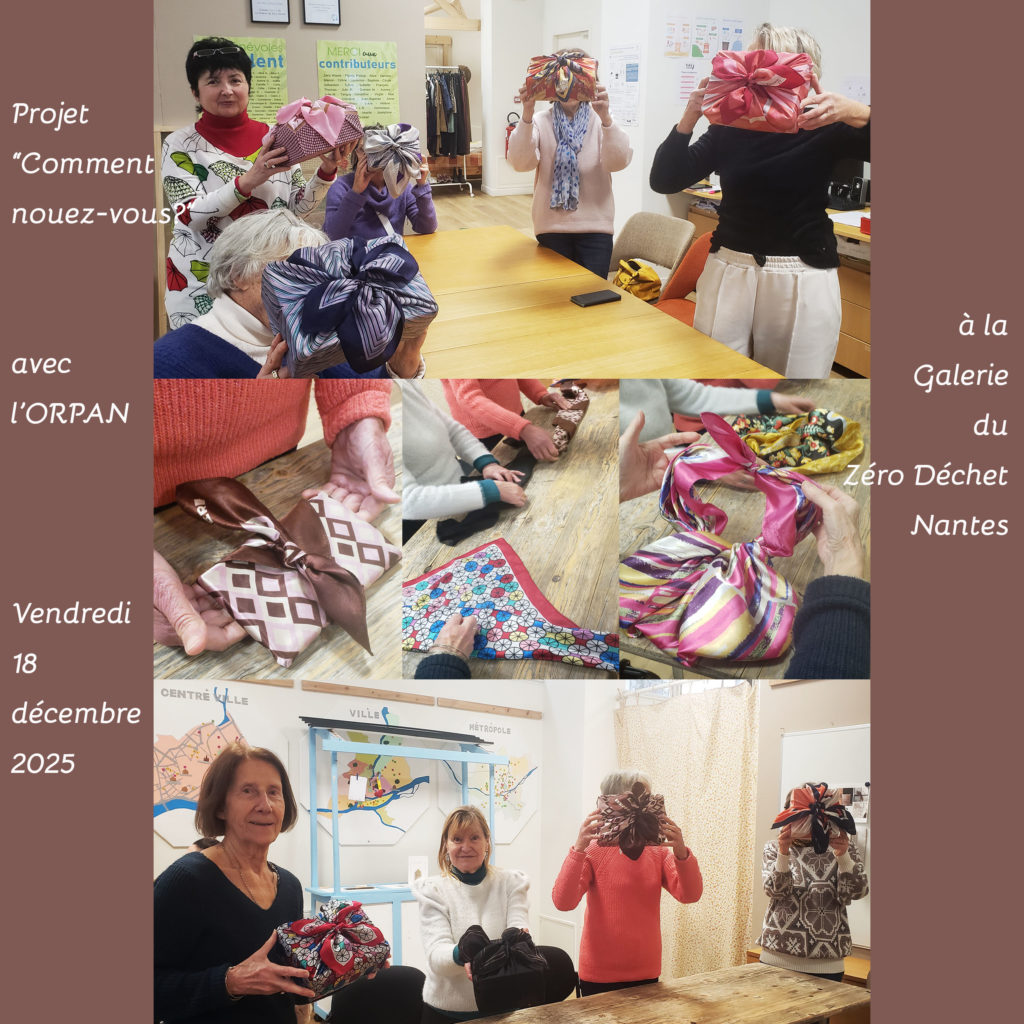 L’Atelier du Furoshiki était à La Galerie du Zéro Déchet à Nantes le vendredi 18 décembre 2025 pour animer un atelier furoshiki avec l’ORPAN, association des séniors nantais.e.s et pour échanger et récolter des témoignages autour du nouage de tissu.