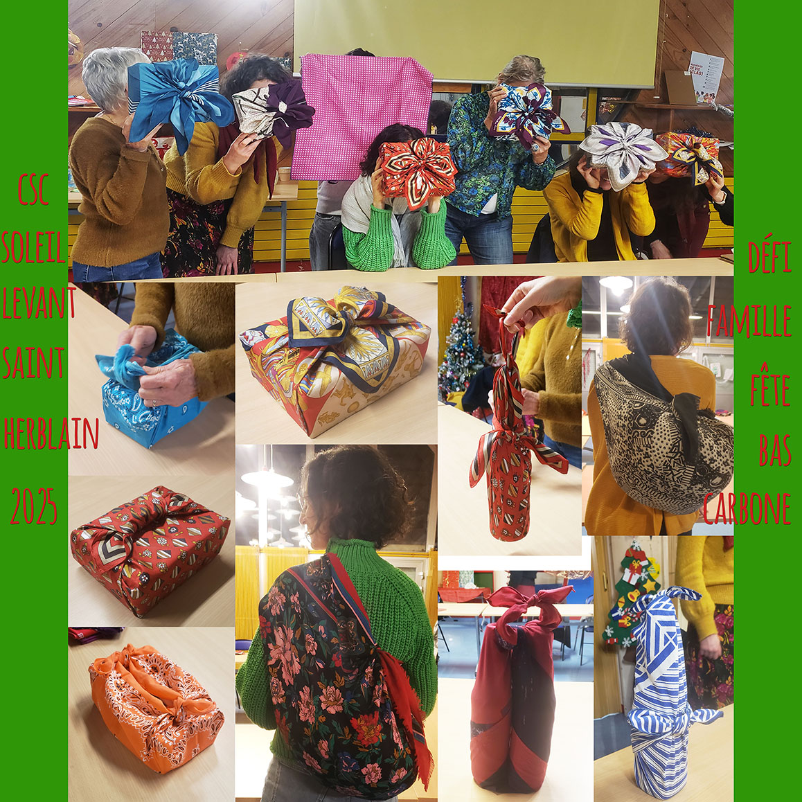 Mercredi 17 décembre 2025 en soirée, L’Atelier du Furoshiki a animé une initiation au furoshiki à La Maison du petit bois à St-Herblain pour un Défi « Fête Bas Carbone » lancé par par le CSC du Soleil Levant de St-Herblain dans le cadre du Défi Climat Nantes Métropole.